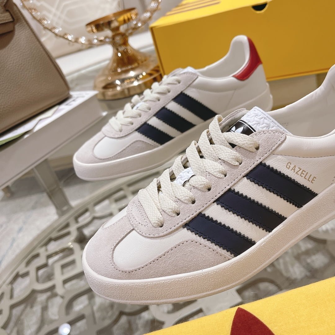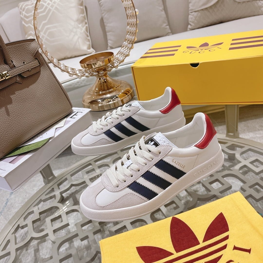 Gucci Trefoil label. print. three-stripe trim. “Gazelle” print