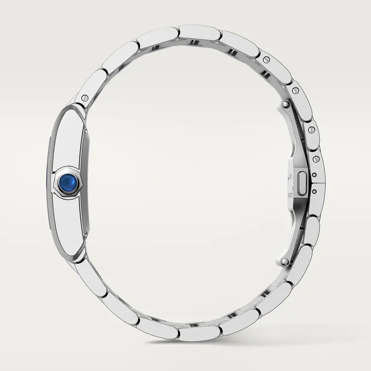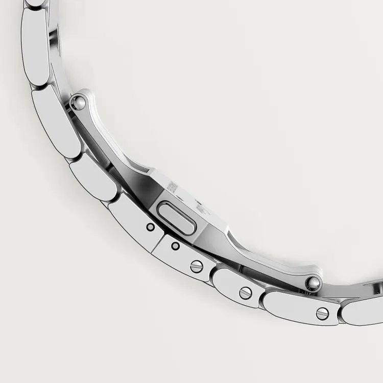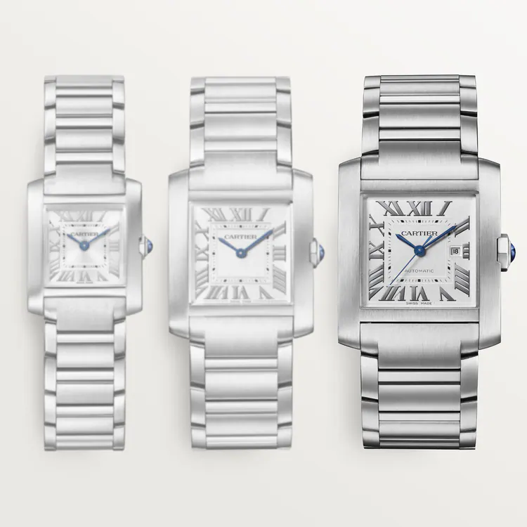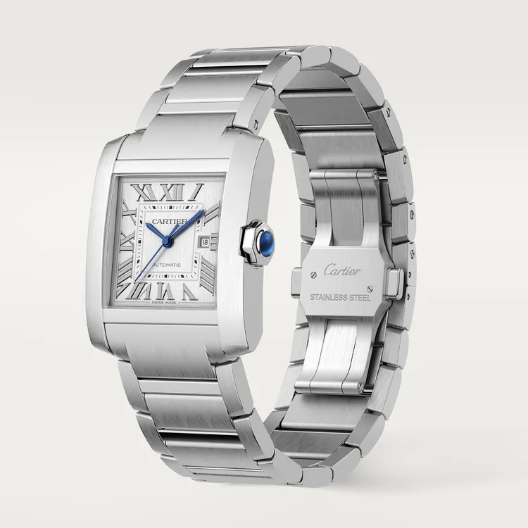 Tank Française watch. large model. mechanical movement with automatic winding. Steel case. Faceted crown in steel decorated with a synthetic cabochon-shaped spinel. Silvered dial. blued-steel sword-shaped hands. sapphire crystal. Steel bracelet. Case dimensions: 36.7 mm x 30.5 mm. thickness: 10.1 mm. Water-resistant up to 3 bar (approx. 30 meters/100 feet).