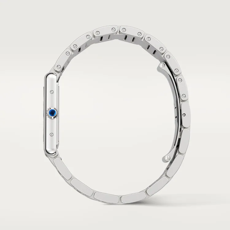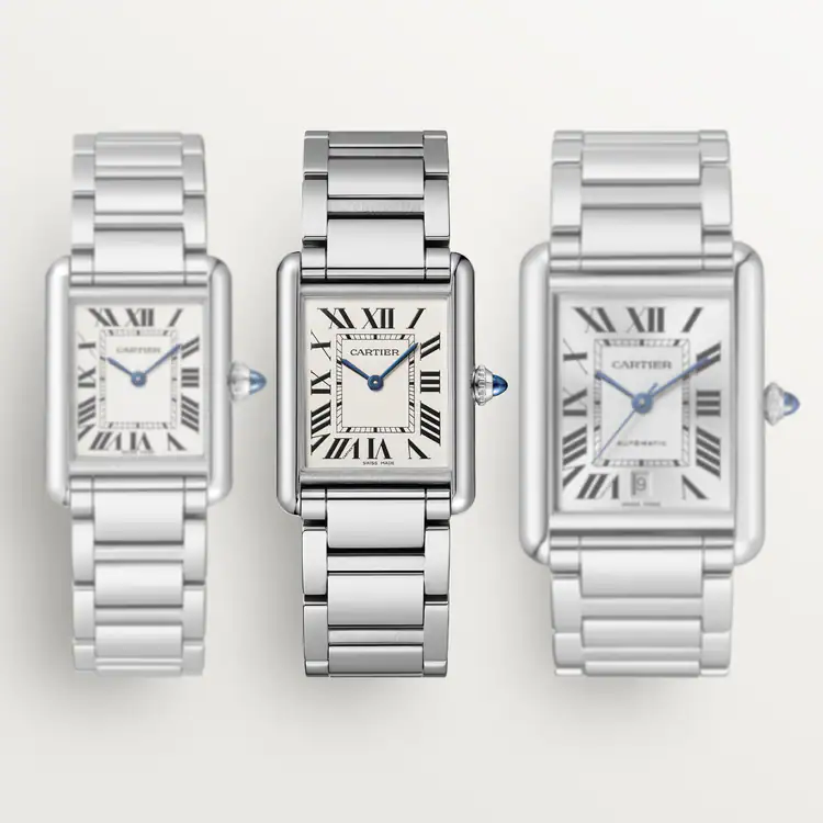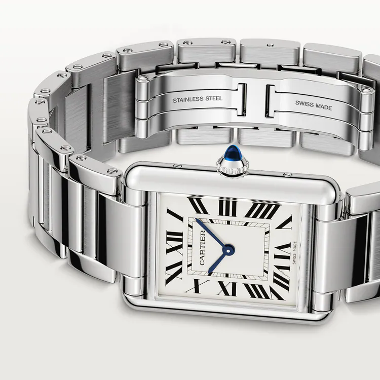 Tank Must watch. large model. high autonomy quartz movement. Steel case. beaded crown set with a synthetic cabochon-shaped spinel. silvered dial. blued-steel sword-shaped hands. interchangeable steel bracelet. Case dimensions: 33.7 mm x 25.5 mm. thickness: 6.6 mm. Water-resistant up to 3 bar (approx. 30 meters/100 feet).