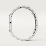 Tank Must watch. large model. high autonomy quartz movement. Steel case. beaded crown set with a synthetic cabochon-shaped spinel. silvered dial. blued-steel sword-shaped hands. interchangeable steel bracelet. Case dimensions: 33.7 mm x 25.5 mm. thickness: 6.6 mm. Water-resistant up to 3 bar (approx. 30 meters/100 feet).