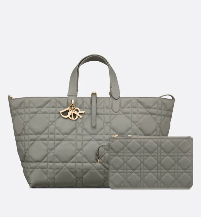 The Dior Toujours bag is distinguished by a casual and practical design. Crafted in stone gray calfskin with Macrocannage topstitching. it showcases a spacious interior compartment with a matching pouch to organize the essentials. Its leather strap closure keeps items secure while the D of the CD Lock closure twists to adjust the sides and enhance the bag’s silhouette. The leather handles can be adjusted using the small notches in order to be able to carry the large bag by hand or wear it over the shoulder.
